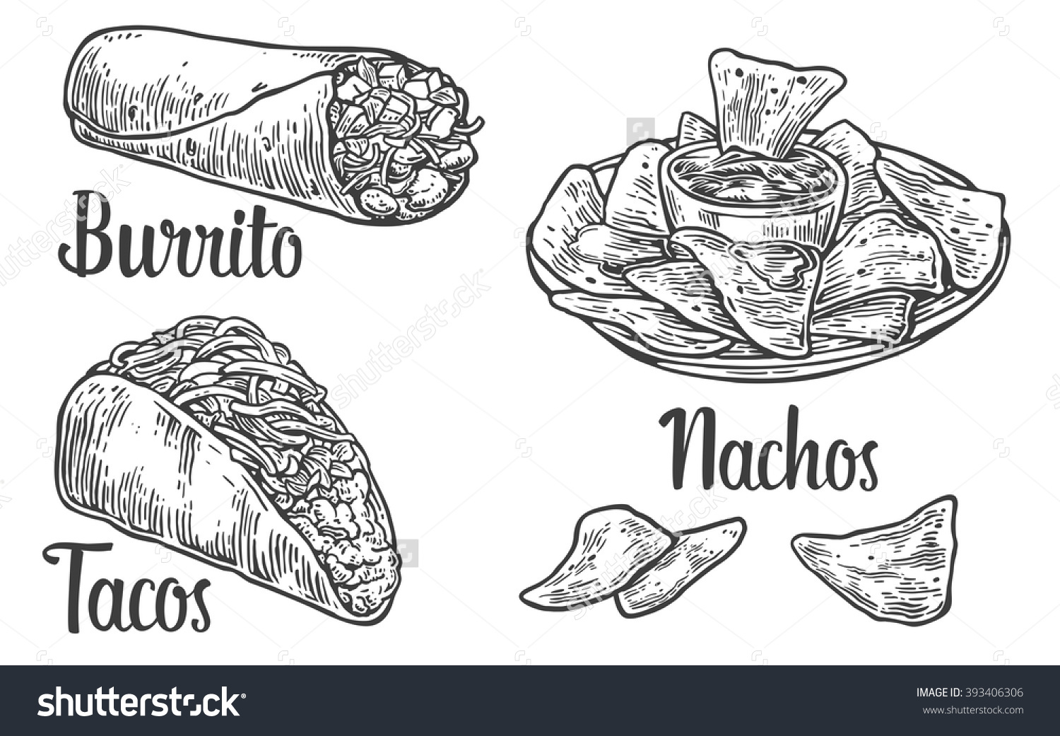 stock-vector-mexican-traditional-food-set-with-text-message-burrito-tacos-chili-tomato-nachos-vector-393406306 10 Maggio 2017 Tacos di pollo o manzo 1500 × 1041