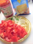 Estraete la placca dal forno, spalmatele bene con il sugo di pomodoro, mettete al centro il pomodoro fresco tagliato a dadini, i dadini di mozzarella, una fogliolina di basilico, un po’ di parmigiano, un giro d’olio.