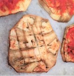 Accendete il forno a 200°. Sciacquate le melanzane, eliminate il picciolo e pelatele con un pelapatate. Tagliatele a fette di 1 cm. l’una, ponetele in una teglia ricoperta da cartaforno, incidete la polpa leggermente formando dei rombi,salatele ed oliatele bene. Ponete ora nel forno caldo per una decina di minuti.