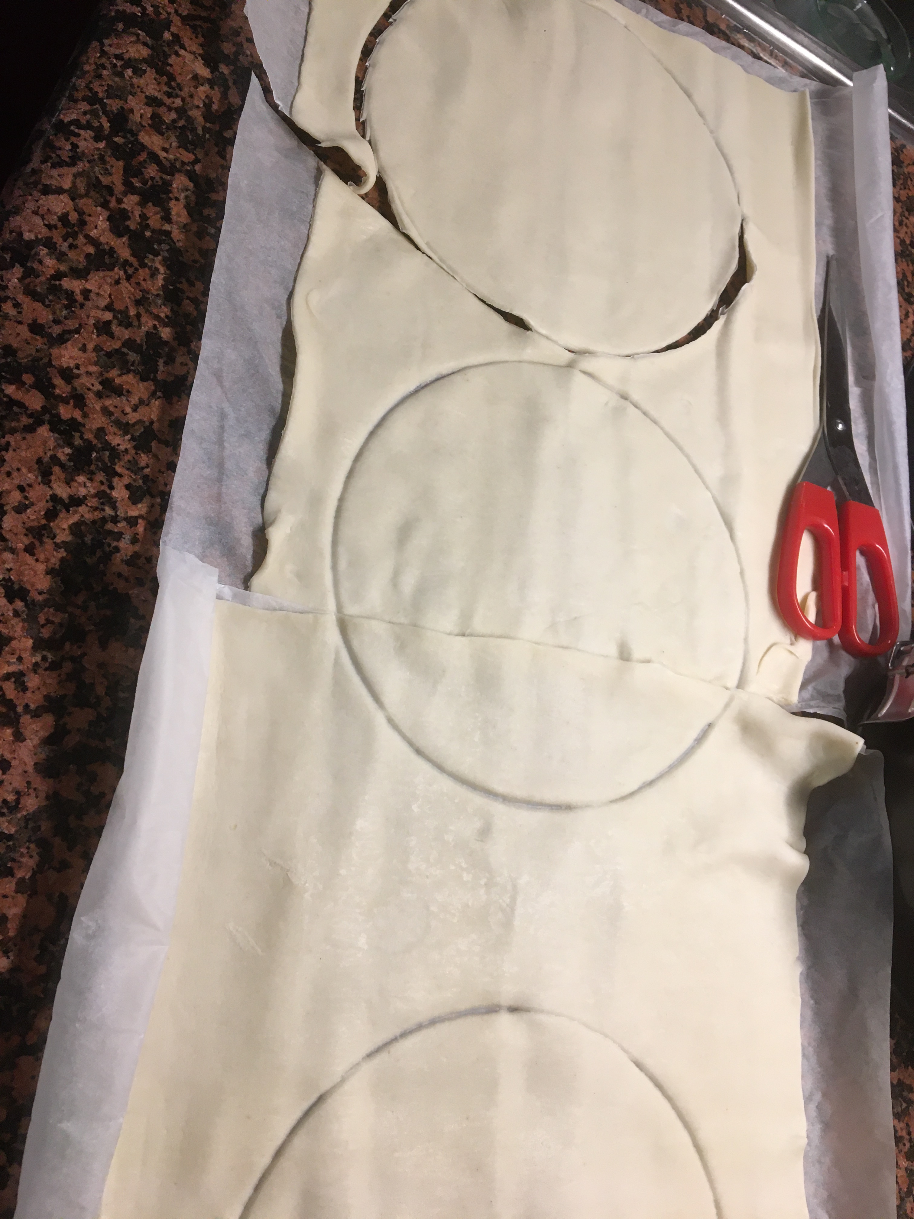 Srotolate la pasta sfoglia con tutta la carta antiaderente, unite i due fogli a formare un unico rettangolo poi disegnate 3 cerchi uguali e tagliateli con un paio di forbici ( sempre con la carta sottostante).
