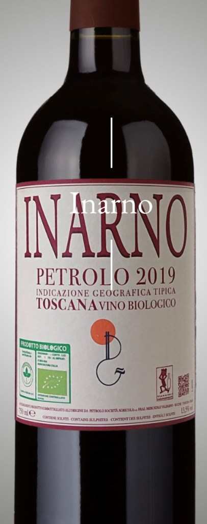 Lasciatemi parlare ora di un ottimo vino, che amo veramente: Inarno Petrolo 2019 I.g t Toscana, vino biologico.