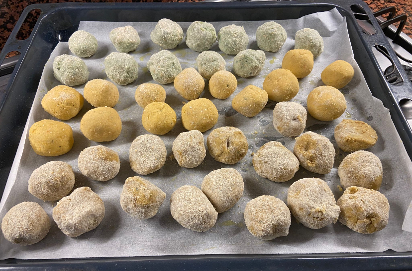 Ora posizionate le polpette ( delle dimensioni da voi definite) su una placca , sopra un foglio di carta da forno leggermente unto ed infilate nel forno preriscaldato a 170° per una venti minuti. Poi muovete la placca per girare le polpette e terminate la cottura per altri 10 min.