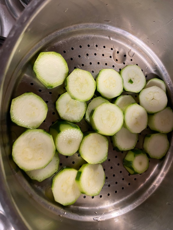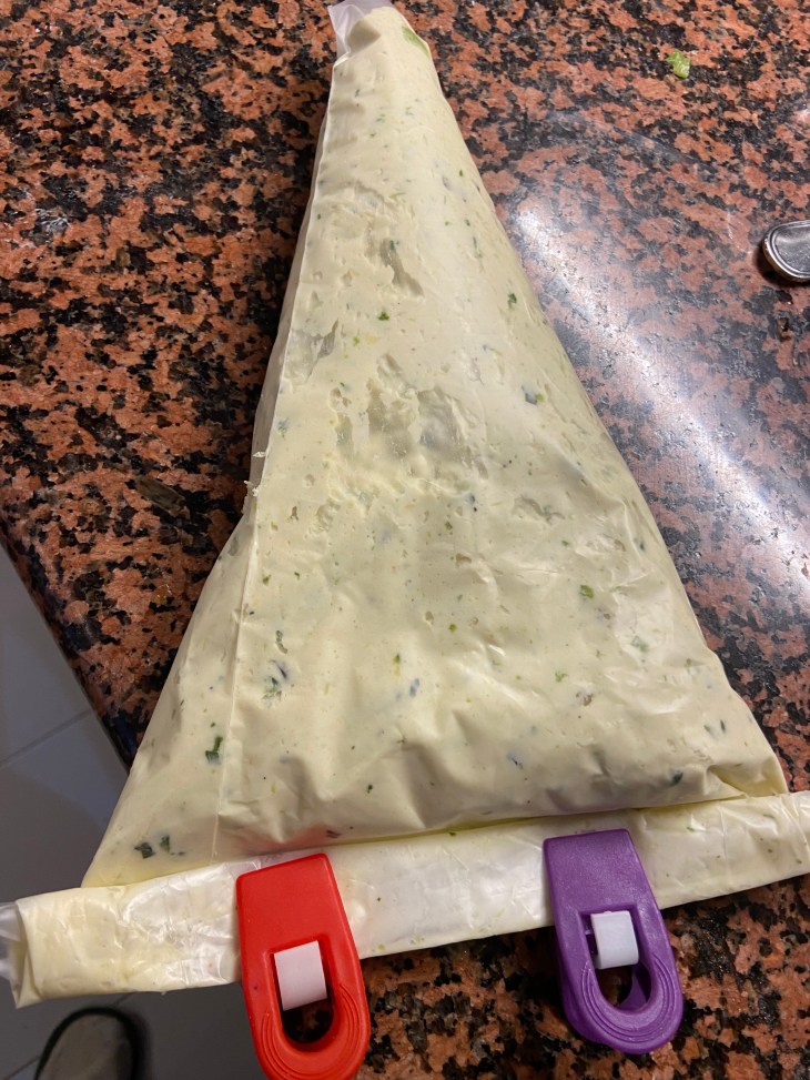 In una ciotola ponete le zucchine lesse raffreddate e ben schiacciate, la ricotta, il grana, il tuorlo, il basilico finemente spezzettato e 3/4 della farina. Salate e pepate poi lavorate bene l’impasto per qualche minuto aggiungendo l’ultima farina un po’ per volta, sino ad avere un impasto molle ( solitamente necessito di tutta la farina ma dipende dall’umidità delle zucchine). Infilate tutto l’impasto in una sac a poche monouso e riponetela in frigo per almeno un paio d’ore ( anche di più se desiderate ).