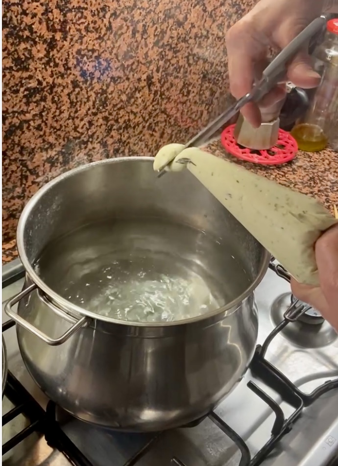 Ora fate cadere l’impasto direttamente nell’acqua bollente salata, tagliando ogni pezzetto di gnocco con le forbici.