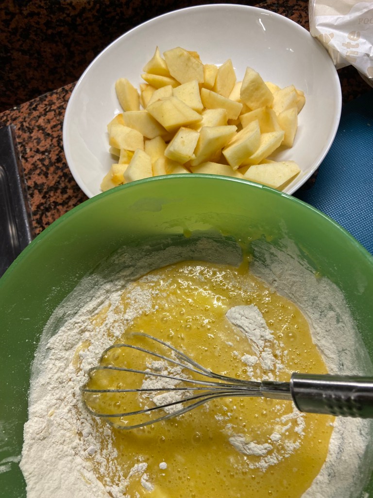 Mescolate molto bene il composto quindi aggiungete anche le mele: un’altra mescolata all’impasto e versate tutto in una tortiera , rivestita di carta forno ( bagnata e strizzata).